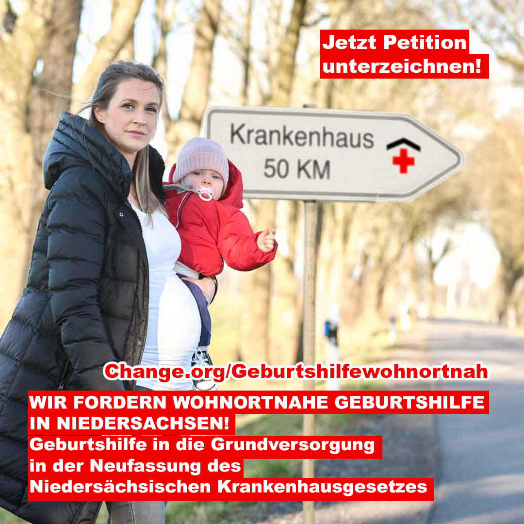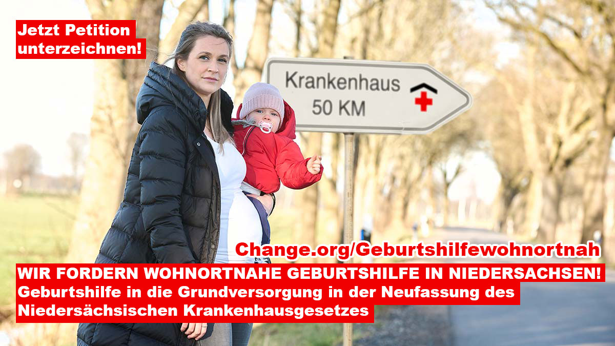 Das Niedersächsische Aktionsbündnis „Gesundheit rund um die Geburt“ sieht die wohnortnahe Versorgung in Gefahr und hat die Petition bei Change.org gestartet. Der aktuelle Entwurf des niedersächsischen Krankenhausgesetzes steht vor der Neufassung sieht vor, die Geburtshilfe als Fachabteilung einzustufen. Die Erreichbarkeit eines Kreißsaals würde – bei guten Verkehrsverhältnissen - auf 45 Minuten hochgesetzt. Dies ist aus der Sicht des Aktionsbündnisses nicht zumutbar. Es hat eine Petition gestartet, die sich für eine flächendeckende und wohnortnahe Geburtshilfe in der Grundversorgung einsetzt. Die zeitnah geplante Verabschiedung des neuen Krankenhausgesetzes für Niedersachsen erfordert rasches Handeln.